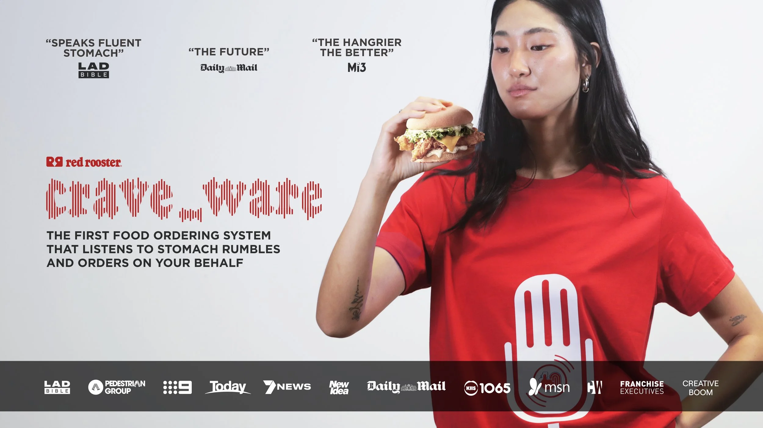 Enter, crave_ware, an AI-powered solutiondesigned to satisfy hunger cravings in realtime. Giving convenience a whole newmeaning. The crave_ware technology wasinstalled into a Red Rooster t-shirt, and wasdesigned to listen to and categorise people’sstomach rumbles, distinguishing them fromall those other bodily noises (yep… all ofthem). Then, placed a personalised mealorder on behalf of the customer based onthe intensity and duration of their tummyrumbles. Talk about fast.