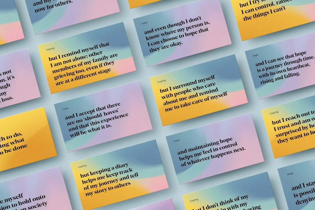 Created with global ambiguous loss expert, Dr Sarah Wayland, the Hope Narratives are designed to help people find a way through the grief, and to know they are not alone. The cards combine over 500 collective years of experience into 145 modular statements, which connect to become over 1.4 million possible Hope Narratives.