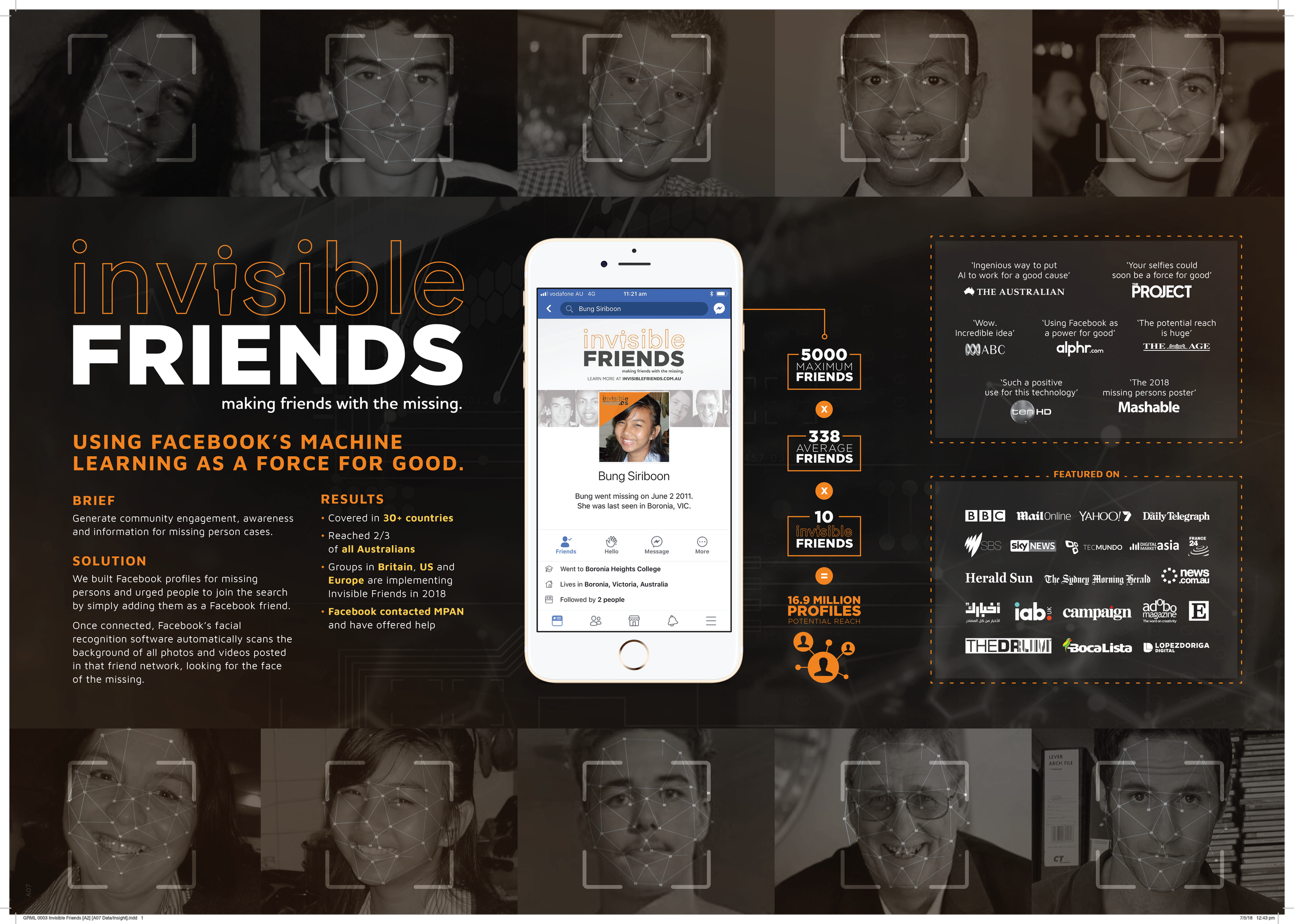 Invisible Friends was a campaign where Facebook profiles were built for missing persons, that use Facebook's inbuilt facial recognition to search for them. For the public to offer their help in the search all they had to do was 'Add Friend'.